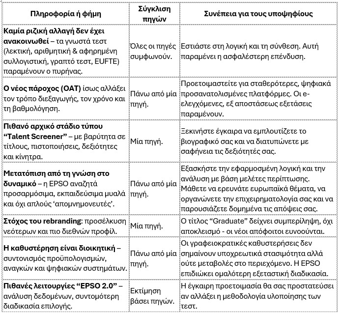 Το “Graduate” rebranding της EPSO μπορεί να είναι απλώς ένα επιφανειακό φτιασίδωμα του τεστ - ή το προοίμιο ενός πιο έξυπνου, ευέλικτου διαγωνισμού. Σε κάθε περίπτωση, όσοι προετοιμάζονται έγκαιρα σαν να πρόκειται να αντιμετωπίσουν μία απαιτητικότερη δοκιμασία, θα είναι οι μόνοι πραγματικά έτοιμοι να αντιμετωπίσουν τον νέο διαγωνισμό - είτε όντως αυτός δυσκολέψει, είτε όχι!